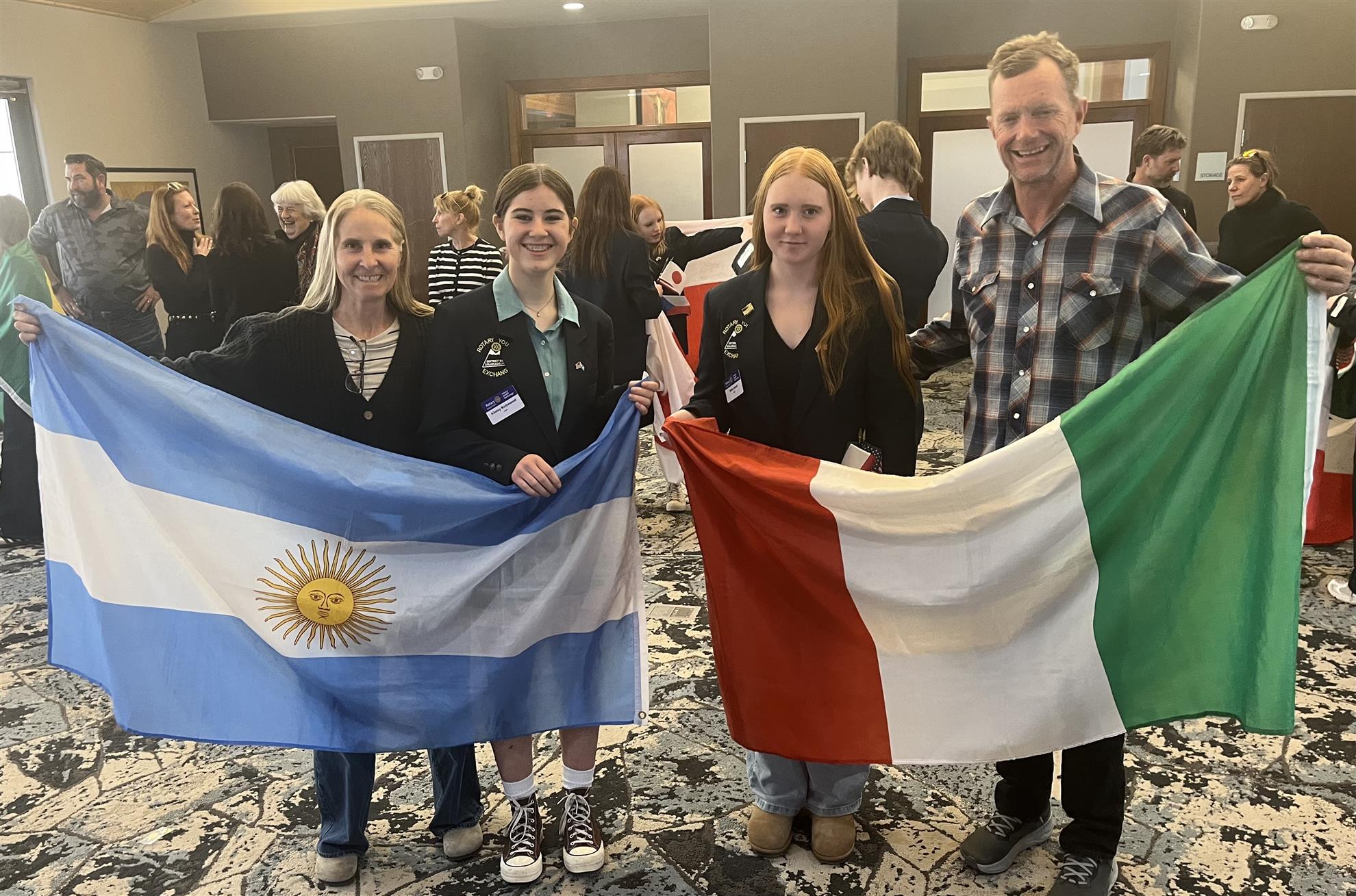 Congratulations to our selected 2026-27 Outbound Rotary Youth Exchange students from Carbondale, Kinley (Argentina) and Ruby (Italy), who earned their official RYE Blazers at OB Orientation in Montrose last weekend, along with 10 other Outbound students from across District 5470. Kinley and Ruby are pictured here with their country flags and parents, Lisen and Aubrey.